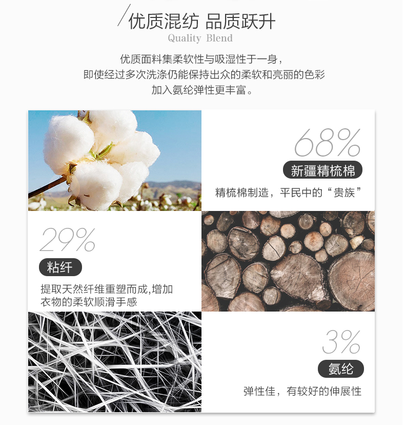聚氨酯弹性纤维(氨纶)3%,粘胶纤维(粘纤)29%,棉68%